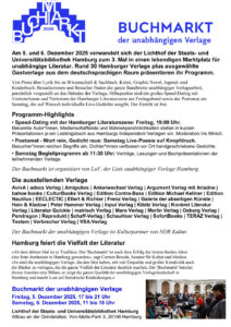 Freitag, 5.12. von 17 bis 21 Uhr, das Programm auf der Bühne beginnt um 19 Uhr: Speed-Dating mit der Hamburger Literaturszene: Autor*innen und Medienschaffende stellen je ein Lieblingsbuch aus Hamburgs Independent-Verlagen vor, moderiert von der tollen Iris Minich.